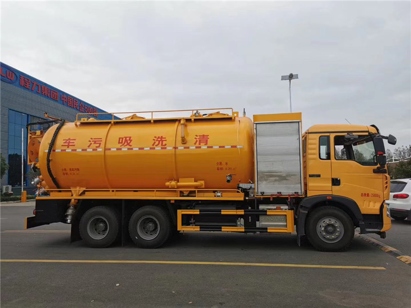 這款車型通車工程黃,標準配置了通徑25高壓管60米,后封頭下部開600mm內通徑液壓排污口1個,后蓋左下6寸排污閥1個,后蓋右下4寸排氣閥1個,4寸吸污閥1個,防溢流裝置,后尾部裝雙箭頭燈,清水罐頂部裝1個排氣閥,清水罐底部裝1個排水閥,罐體兩側平臺用優質碳鋼材質,底盤空間充分利用,排氣管和水循環管不占用平臺空間,循環水管上裝1個洗手龍頭等等。
