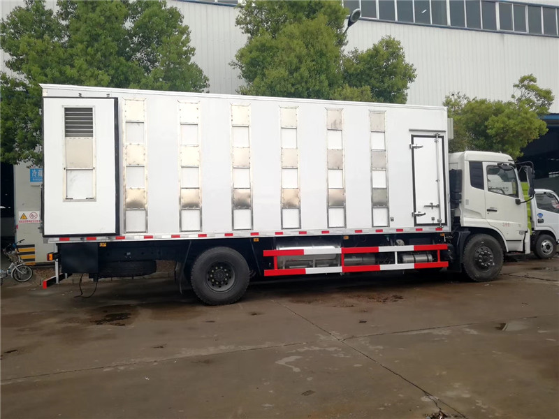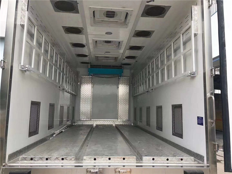 這款東風多利卡豬仔運輸車恒溫系統。由車載制冷機,暖風機,氣體混合輸送倉,排風扇等組成,實現豬仔生存空間氣體的流通和恒溫。 噴淋系統。由氣壓水箱,管道,噴頭,污水收集箱組成,給豬仔噴淋降溫,箱體內清潔。 供電系統。配備微型發電機,給相關設備供電。分層裝載機構:箱體內設置2層分層裝載機構,通過液壓系統,實現隔板的升降,每層隔板配置分欄隔斷。