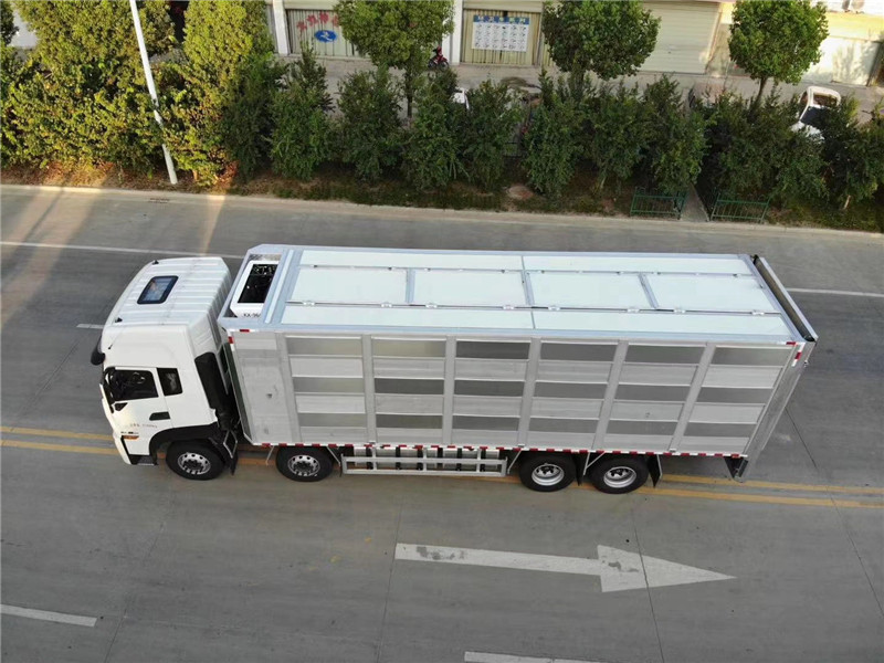 上裝為鋁合金廂式結構,廂長6.8米,寬2.5米,高2.6米,開模型材插接式焊接,車身質量輕強度高防 腐蝕性強可耐80度高溫消毒,廂體有效避免高溫傳導,內部通道和頂板可翻轉,便于裝卸清洗,車廂恒溫、燃油加熱、監控,標配三層混合隔倉共18個降溫噴霧和18個喂食飲水咀,可開合側窗、每層4個高轉速防水通風排氣扇、每層備用電瓶2個可供排氣扇使用7小時,風扇排風量 m3/h 500、1200、1400、2200,后部液壓圍板裝卸1.5噸承載力、同步穩定上升速度快、圍板面積5平方,三層每層高850mm四層每層高620mm,裝運面積每層14.25平方,三層可拉80頭125公斤豬,4層可拉850頭8公斤小豬苗。